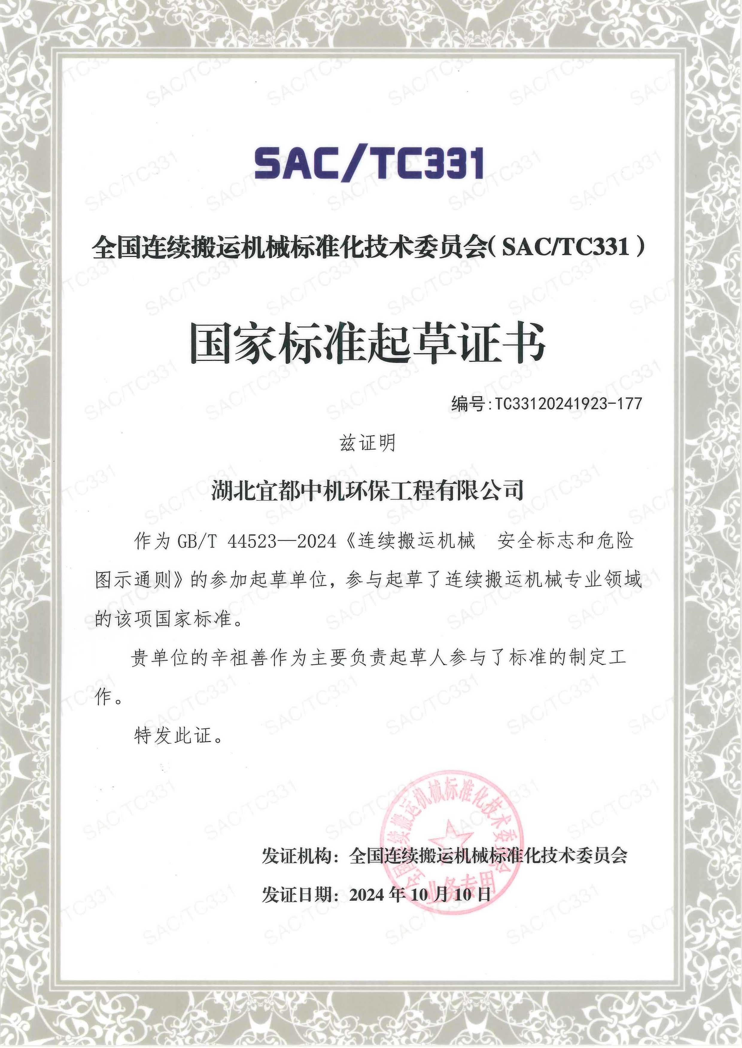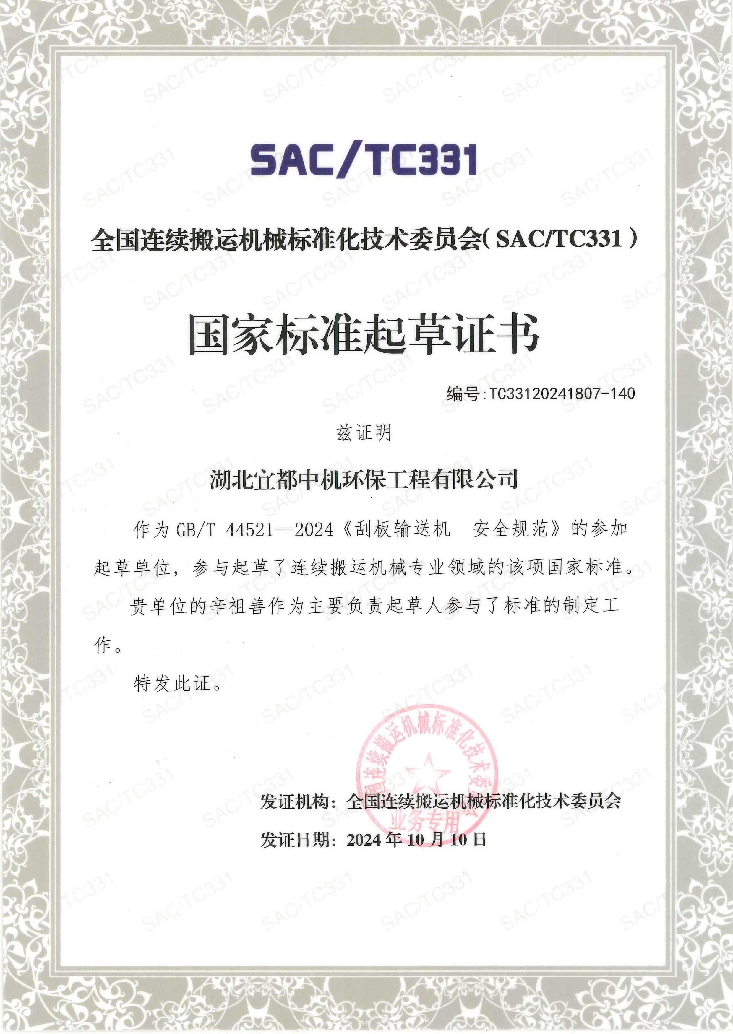 國家標(biāo)準(zhǔn)起草證書《埋刮板輸送機(jī)》